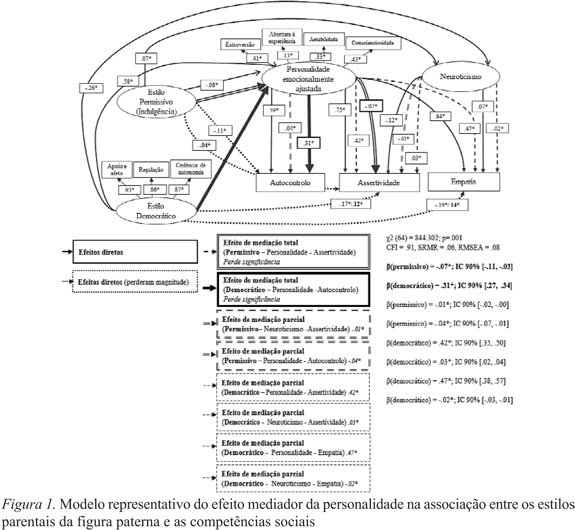 A partir dos resultados obtidos foi possível observar um efeito inicial positivo entre o estilo parental democrático de ambas as figuras parentais face as competências sociais dos jovens, nomeadamente a empatia (β=.29/.35), assertividade (β=.29/.31) e o autocontrolo (β=.34/.35), do pai e da mãe respetivamente. Verificou-se ainda que o estilo parental autoritário das figuras parentais apresenta um efeito inicial positivo face à assertividade (β=.09/.14). Por último, observa-se que o estilo parental permissivo (indulgente) apresenta um efeito inicial negativo face às competências sociais, nomeadamente, a assertividade (β=-.08/-.08) e o autocontrolo (β=-.19/-.18). Posteriormente foi analisado o papel de dois mediadores, nomeadamente, as características da personalidade emocionalmente ajustadas (extroversão, amabilidade, abertura à experiência e conscienciosidade) e o neuroticismo tendo em conta as três dimensões dos estilos parentais: democrático (apoio e afeto, regulação, cedência de autonomia e participação democrática), autoritário (punição e coerção física) e permissivo (indulgência) através do programa AMOS.
