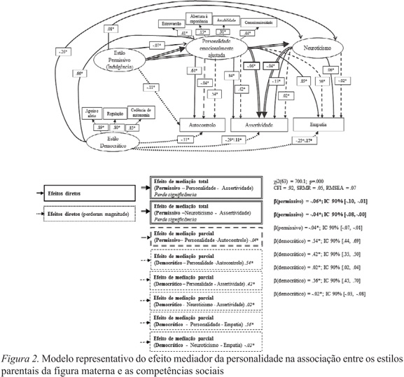 No que diz respeito à figura materna, verificou-se que o estilo parental democrático prediz positivamente as características positivas da personalidade (β=.66) e negativamente o neuroticismo (β=-.26). Por sua vez, verificou-se que o estilo parental permissivo (indulgência) prediz negativamente as características da personalidade emocionalmente ajustadas (β=-.07) e positivamente o neuroticismo (β=.08). Verificou-se ainda que as características positivas da personalidade predizem positivamente a empatia (β=.89), a assertividade (β=.84) e o autocontrolo (β=.64). O neuroticismo, por sua vez, prediz positivamente a empatia (β=.06) e negativamente a assertividade (β=-.13). Após ser realizado o método de Bootstrap para testar o papel mediador das características da personalidade emocionalmente ajustadas, observou-se que o efeito direto inicial dos estilos parentais da figura materna sobre as competências sociais perde magnitude (empatia β=-.25; assertividade β=-.29; autocontrolo β=-.11). Tal como verificado para a figura paterna, o efeito de supressão também está presente no modelo referente à figura materna (MacKinnon et al., 2000). Após uma primeira análise, observa-se uma mediação parcial com efeito positivo das características positivas da personalidade na associação do estilo democrático da mãe e a empatia (β(democrático)=.56; IC 90% [.45, .70]), o autocontrolo (β(democrático)=.54; IC 90% [.44, .69]) e a assertividade (β(democrático)=.42; IC 90% [.35, 50]). A partir dos resultados obtidos verificou-se que a personalidade emocionalmente ajustada não tem um efeito mediador na associação entre o estilo autoritário e a assertividade (p=.379). Por fim verifica-se que as características positivas da personalidade têm um efeito mediador total negativo na associação entre o estilo permissivo (indulgente) e a assertividade (β(Permissivo)=-.06; IC 90% [-.10, -.01]) e um efeito mediador parcial negativo entre o estilo permissivo (indulgente) e o autocontrolo (β(Permissivo)=-.04; IC 90% [-.07, -.01]) (a href="#f2">Figura 2). De seguida, foi realizado o método de Bootstrap na testagem do papel mediador do neuroticismo, observando-se que o efeito direto inicial dos estilos parentais da figura materna sobre as competências sociais perdeu magnitude (empatia β=.17; assertividade β=.11). Posto isto, observou-se uma mediação parcial com efeito negativo do neuroticismo na associação do estilo democrático e a empatia (β(democrático)=-.02; IC 90% [-.03, -.08]) e um efeito mediador parcial positivo relativamente a assertividade (β(democrático)=.02; IC 90% [.02, .04]). A partir dos resultados obtidos verificou-se que o neuroticismo não tem um efeito mediador na associação entre o estilo autoritário e a assertividade (p=.595). Foi ainda obtido um efeito mediador total negativo do neuroticismo na associação entre o estilo permissivo (indulgência) e a assertividade (β(democrático)=-.04; IC 90% [-.08, -.00]) (Figura 2). O modelo de mediação apresenta índices do ajustamento adequados (χi2(63)=700.1; p=.000, CFI=.92, SRMR=.05, RMSEA=.07) (Figura 2). Observa-se que para ambas as figuras parentais o valor do Qui-Quadrado e do Ratio são elevados, podendo esse aspeto ser justificado pela grande dimensão da amostra (Bentler & Bonnet, 1980).