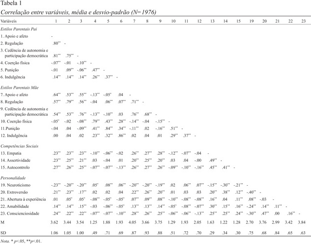 Partindo do objetivo de analisar as associações entre os estilos parentais, as competências sociais e a personalidade nos jovens foram realizadas análises correlacionais entre as diferentes variáveis que se encontram descritos na Tabela 1.