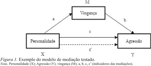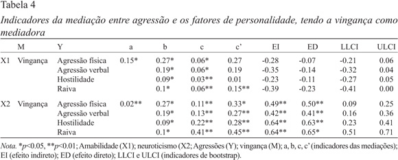 Para avaliar o papel mediador da vingança na relação entre traços de personalidade (amabilidade, conscienciosidade, neuroticismo, abertura à mudança e extroversão) e agressão (agressão física, agressão verbal, hostilidade e raiva), primeiramente, procederam-se análises de correlação r de Pearson para verificar a correlação prévia entre essas variáveis (Hair et al., 2009). Em seguida, utilizou-se o procedimento indicado por Hayes (2012) utilizando o macro PROCESS (http://afhayes.com) para as análises de mediação simples (modelo 4).