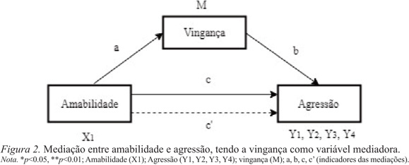 Como observado na Tabela 4, os modelos da agressão física, verbal e hostilidade não se ajustaram aos dados adequadamente, pois esses traços não apresentaram correlação significativa. Contudo, no modelo 4, a amabilidade (c=-0.23) e a vingança (b=0.02) predizem a raiva. O efeito indireto foi estatisticamente significativo (c’=-0.16; 95% CI [-0.26, -0.07]), indicando que existe mediação entre essas variáveis.