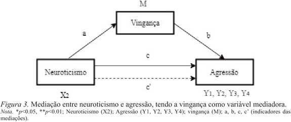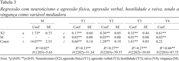 No modelo 6, o neuroticismo foi preditor da agressão verbal (c=0.26), que também foi significativamente predita pela vingança (b=0.03). O efeito indireto indica que houve uma mediação (c’=0.05; 95% CI [0.10, 0.13]). O modelo 7 apresentou o neuroticismo (c=0.32) e a vingança (b=0.01) como preditores da hostilidade; essa interação teve um efeito indireto significativo (c’=0.02; 95% [0.004, 0.005], ou seja, o modelo ajustou-se adequadamente aos dados. Em relação à raiva, modelo 8, o neuroticismo é observado como seu preditor (c=0.61), assim como a vingança (b=0.02). O efeito indireto foi estatisticamente significativo (c’=0.03; 95% CI [0.003, 0.078]), indicando que existe mediação entre essas variáveis.