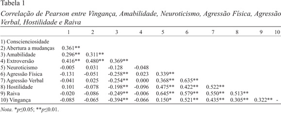 No que diz respeito às correlações r de Pearson (Tabela 1), o fator amabilidade apresentou relações significativas e negativas com agressão física (r=-0.258; p<0.01), agressão verbal (r=-0.254; p<0.01), hostilidade (r=-0.198; p<0.01), raiva (r=-0.249; p<0.01) e vingança (r=-0.394; p<0.01). O Neuroticismo apresentou correlações significativas e positivas com agressão física (r=0.339; p<0.01), agressão verbal (r=0.368; p<0.01), hostilidade (r=0.475; p<0.01), raiva (r=0.645; p<0.01) e vingança (r=0.150; p<0.05). Os outros fatores de personalidade não se correlacionaram com a vingança nem com a agressão. Ademais, puderam ser observadas correlações significativas e positivas de vingança e agressão física (r=0.521; p<0.01), agressão verbal (r=0.435; p<0.01), hostilidade (r=0.305; p<0.01) e raiva (r=0.322; p<0.01).