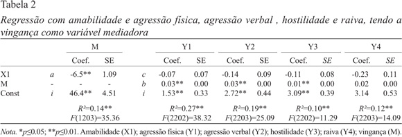 Assim, conforme as figuras apresentadas (Figura 2 e Figura 3), foram testados os modelos de mediação tendo amabilidade (X1) e neuroticismo (X2) numa relação direta com agressão física (Y1), agressão verbal (Y2), hostilidade (Y3) e raiva (Y4) tendo a vingança como variável mediadora (M). Nas Tabelas 2 e 3, estão resumidas as análises de regressão e seus coeficientes. Os resultados serão descritos em dois blocos; o primeiro bloco tendo amabilidade como preditora dos quatro tipos de agressão (modelo 1 agressão física; modelo 2, agressão verbal; modelo 3, hostilidade; modelo 4, raiva) e o neuroticismo como preditor dos mesmos tipos de agressão, respectivamente (modelo 5, agressão física; modelo 6, agressão verbal; modelo 7, hostilidade; e modelo 8, raiva).