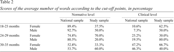 Table 2 shows the scores of the mean number of words spoken by the children spontaneously, according to the caregivers, based on the normative cut-off points for the Portuguese preschool aged population. The results were read considering two levels of severity: normative and clinical levels. The cut-off points differ according to gender (female and male), as well as age group (18-23 months, 24-29 months, 30-35 months). A percentile ≤15 suggests delay in language development.
