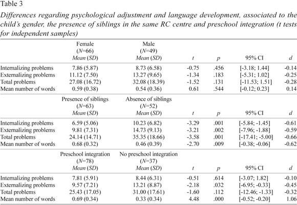 Children who did not have siblings in the same RC centre presented more Internalizing, Externalizing and Total Problems than children living with their siblings. The mean number of words of children who did not have siblings in the same RC was significantly lower than the mean number of words of children with siblings in the same RC centre. Children who were able to attend a kindergarten outside the RC centre had lower rates of Externalizing Problems and spontaneously used a higher mean number of words than children who did not attend external preschool. These results indicate that the presence of siblings in the same RC centre and the child’s preschool attendance seem to be protective factors to emotional and behavioural problems as well as to the child’s development. Regarding the size of the RC centre, there were statistically significant differences among children in terms of the mean number of words spontaneously used, and the Post Hoc Scheffe test showed that the children housed in large or medium RC centres had an average number of words higher than those in small RC centres.