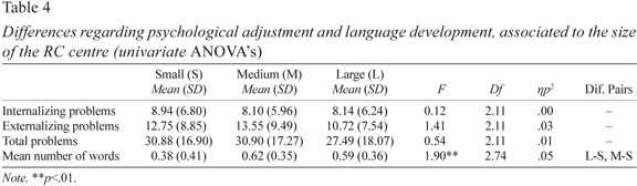 The existence of differences regarding psychological adjustment and language development associated to the child’s gender, the presence of siblings in the same RC centre, preschool integration (Table 3) and the size of the RC centre (Table 4) were analysed. Out of all these variables, only the presence of siblings in the RC centre determined differences between the groups.