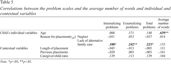 Table 5 presents the matrix of correlations between psychological adjustment measures and language development and individual and contextual variables, such as age, reason for placement (neglect and lack of alternative family care), length of placement, previous placements and caregiver-child ratio. The mean number of words spoken by the children is positively and significantly correlated with age, showing the increase of lexical fields with the child’s age. Regarding the reasons for placement, the lack of alternative family care was positively and significantly correlated with Internalizing, Externalizing and Total Problems. It, thus, reinforced the impact that the child’s previous life experience seems to have on his/her adjustment and development. The contextual variables (length of placement, previous placements and caregiver-child ratio) did not present significant correlations with the scales analysed. The simple linear regression analyses which were performed showed that the lack of alternative family care explained approximately 4% of the variance of Internalizing Problems [R2=.035; F(1.11)=4.13, p=.044], 6% of Externalizing Problems [R2=.059; F(1.11)=7.03, p=.009] and 5% of Total Problems [R2=.050; F(1.11)=5.94, p=.016]. The age of the child explained 41% of the variance of the average number of words [R2=.408; F(1.75)=51.63, p=.000].