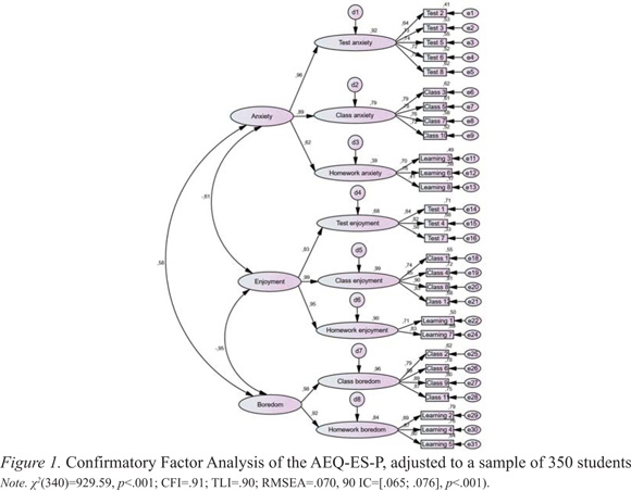 We tested the factor structure of the AEQ-ES-P according to the model proposed by Lichtenfeld et al. (2012). This model postulates a hierarchical structure with eight latent first-order factors that correspond to the eight scales of the AEQ-ES-P measuring the three emotions experienced in each academic setting (class, homework, and tests). It also posits three latent second-order factors corresponding to the three global achievement emotions of enjoyment, boredom, and anxiety (Figure 1). Also following the method used both by Lichtenfeld et al. (2012) and Raccanello et al. (2018), we conducted confirmatory factor analysis (CFA) using the maximum likelihood estimation method, as available in AMOS 24.0. The results of the CFA indicated that this model adequately fits the data (χ2(340)=929.59, p<.001; CFI=.91; TLI=.90; RMSEA=.070, 90IC=[.065; .076], p<.001), according to the criteria suggested by Hair, William, Barry, Rolph, and Ronald (2010) and Kline (2011). All items displayed factor loadings higher than .50 except item eight of the scale homework anxiety, which was, however, retained since its removal did not improve the model fit or the reliability of the scales.