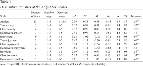 To examine the reliability of the scale, we calculated Cronbach’s alpha coefficients (α) and composite reliability (CR), where values higher than .70 are considered adequate (Hair et al., 2010). As can be observed in Table 1, both Cronbach’s alpha and CR displayed values higher than .80 on most scales. Only one scale, homework anxiety, displayed reliability scores below .70, which, however, exceeds the minimal acceptable value of .60 (Loewenthal, 2004). The global scales (enjoyment, boredom, and anxiety) presented better reliability indices than the scales measuring the achievement emotions in specific academic settings. However, all the reliability scores were between acceptable and excellent, demonstrating the internal consistency of the AEQ-ES-P.