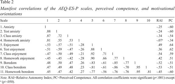 We analyzed the convergent validity of the scale by calculating the average variance extracted (AVE), whose values are considered adequate when higher than .50 (Hair et al., 2010). Adequate values of AVE were found for anxiety (.70), enjoyment (.86), and boredom (.90). Discriminant validity was analyzed by comparing the AVE scores with the maximum shared squared variance (MSV) and the average squared variance (ASV), whose values should be lower than those of the AVE. While the ASV values were lower than those of the AVE for the three achievement emotions (ASVAnxiety=.35; ASVEnjoyment=.64; ASVBoredom=.63), the MSV values were lower than those of the AVE for anxiety (MSV=.38), equal for boredom (MSV=.90), and higher for enjoyment (MSV=.90). These results support the convergent validity of the AEQ-ES-P, but its discriminant validity is somewhat compromised due to the weak discrimination between the boredom and enjoyment scales.