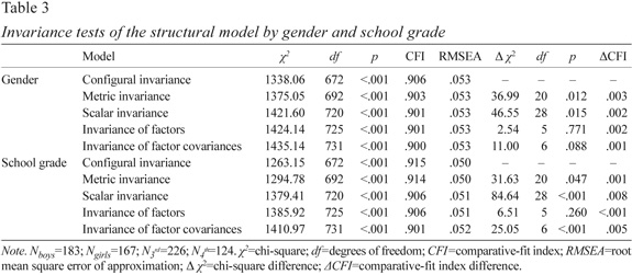 We tested the invariance of the measurement model by gender and school grade to ensure that the factor structure of AEQ-ES-P was equivalent for boys and girls and for third and fourth graders. In both cases, we evaluated invariance by comparing a free model (with freely estimated factor loadings, intercepts, and covariance of factors) with constrained models where factor loadings (λ), intercepts (i), and covariances were fixed. Significant changes were monitored by differences in chi-square values (Δχ2) as well as by changes in CFI (ΔCFI), given that Δχ2 is sensitive to sample size (Cheung & Rensvold, 2002). The model is considered invariant when Δχ2 values are non-significant (p≥.05), or instead when ΔCFI values are lower than .01.
