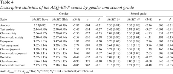 The internal validity of the AEQ-ES-P was supported by the pattern of correlations obtained between all the emotion scales, both global and setting-specific: enjoyment was negatively correlated with anxiety and boredom, which were positively correlated with each other. This pattern was consistent with that found by Lichtenfeld et al. (2012) and Raccanello et al. (2018), as well as with the results obtained in recent studies using elementary school students (e.g., Pekrun et al., 2017).