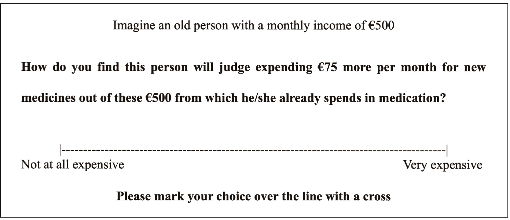 Imagine that a doctor has just prescribed a new medication/supplementary diagnostic test to an elderly patient to tackle a clinical condition. This medication or supplementary diagnostic test should be taken; otherwise, the disease can only deteriorate. Now, this fictitious elderly patient has a monthly pension retirement income of €500 (or €1,000, or €1,500): How costly do you find the amount - corresponding to a certain proportion of the pension retirement income, say 3% - to be expended in this new prescription? In addition, is there an effect of participants’ retirement incomes affecting their judgments of cost?