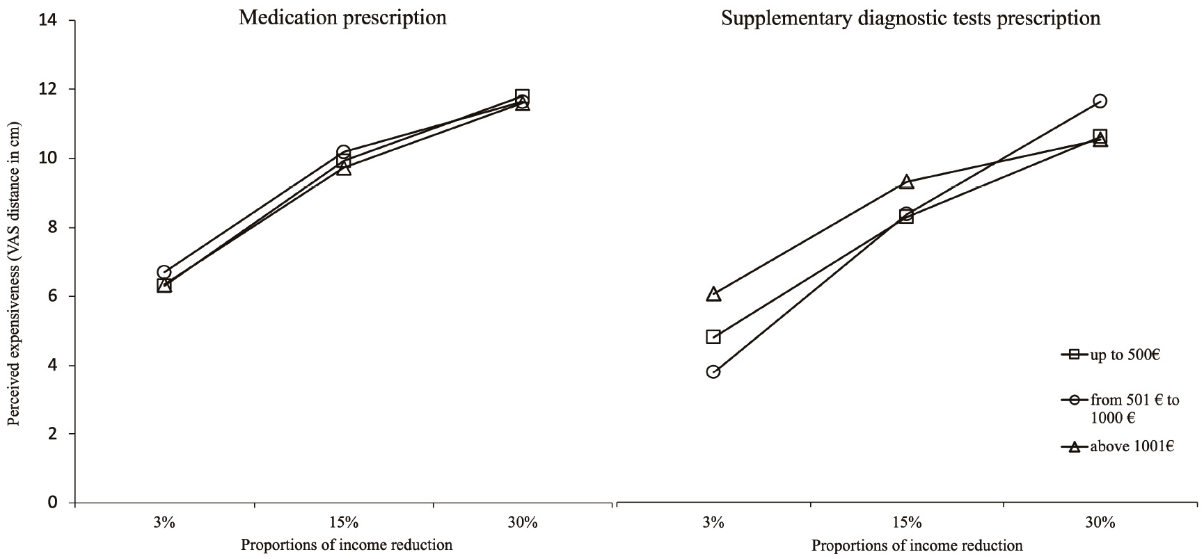 Visual inspection of results across the three proportion levels indicates that expensiveness perception of medication/supplementary diagnostic tests prescription value corresponds to a monotonic increasing function of the Proportion of income reduction of the fictitious patient’s (3%, 15%, and 30%). Such a monotonic increasing function means that the participants were able to compute numbers adequately. Therefore, our conjecture that for both medication/supplementary diagnostic tests, different amounts of money expended in the new medical prescription are perceived as differently costly was partially corroborated by evidence. Indeed, within 3% and 30% proportion levels, perception of expensiveness was differently evaluated. Nevertheless, in both proportions, participants’ perceived expensiveness decreases as prescription values increase in tandem with fictitious patient’s values of monthly income. The exception came with the proportion of 15%, corresponding to different prescription values (€45, €150, €225). Within this level, prescription values were perceived as the same, irrespective of the fictitious patient’s income (€500, €1,000, and €1,500).