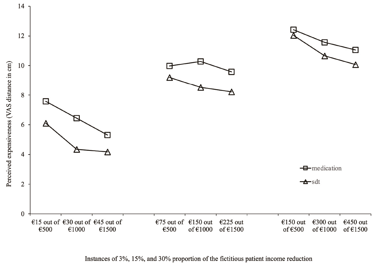 We conjectured that a varying perceived cost of medication/supplementary diagnostic tests, as computed from a proportion of income, would express itself in a gradient following from small to high amounts of income reduction, as captured by a visual analogue scale (Jensen & Karoly, 2011). Thereby showing participants can do the simple math translated into increasing functions of perception of cost to increasing amounts of money.
