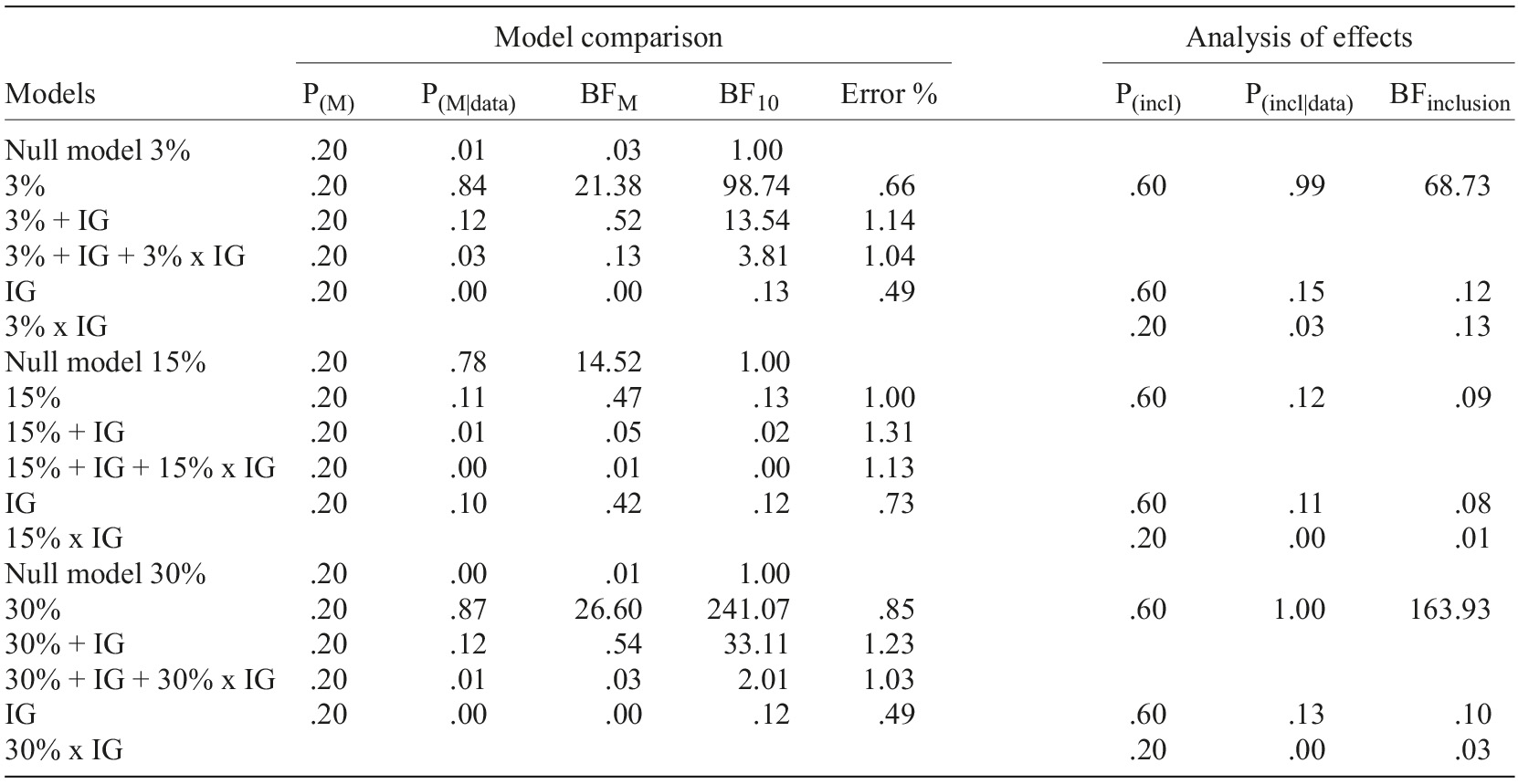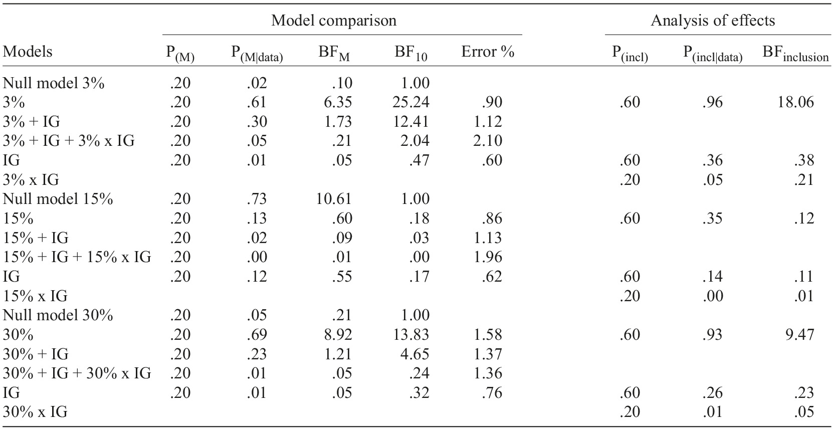 Note. Model comparison=all models include subject; %=proportion of income reduction of the fictitious patient; IG=participants’ income group (up to €500, between 501 and €1,000, and €1,001 and above); P(M)=uniform distribution of prior models’ probabilities across models; P(M|data)=posterior model probabilities; BFM=change of prior to posterior model odds; BF10=Bayes factor H1
