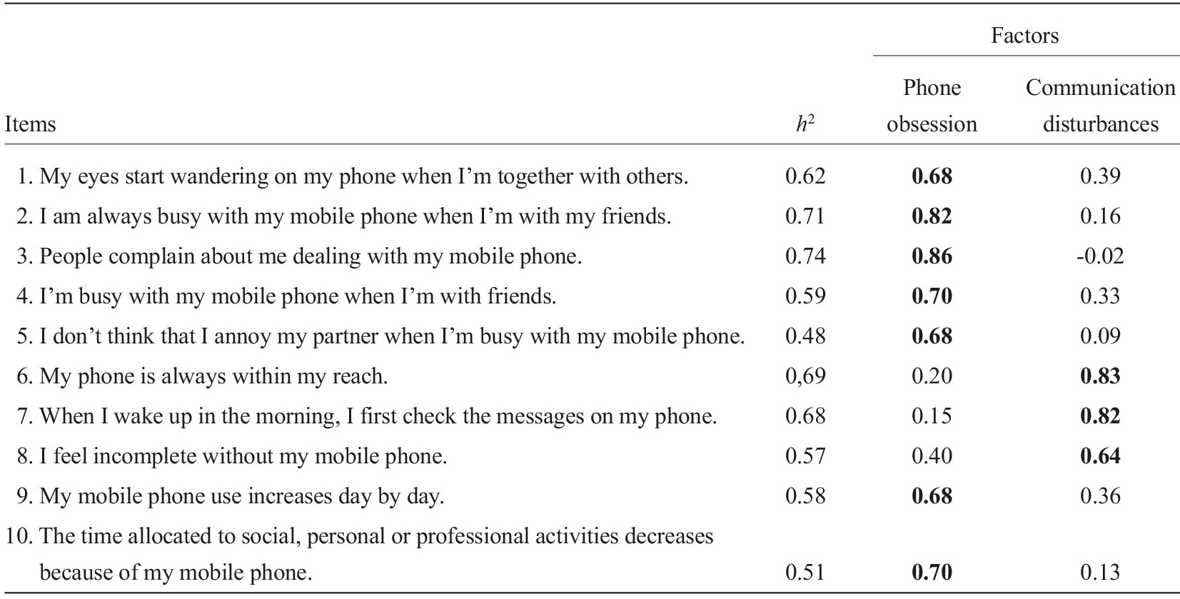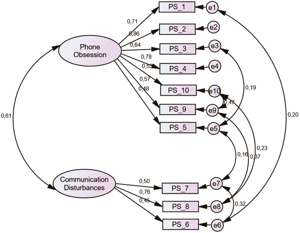 The value of Cronbach’s alpha in this study (phone obsession α=0.84; communication disturbances α=0.69) is lower than that of the original version (phone obsession α=0.85; communication disturbances α=0.87; Karadağ et al., 2015), and in the original version the instrument also consisted of 10 items and 2 factors (phone obsession; communication disturbances). The values of CR, AVE and discriminant validity are within the reference values, as shown Table 2. In the original version, the items were evenly distributed. In this study, the phone obsession factor contains 7 items and the communication disturbance factor contains 3 items.