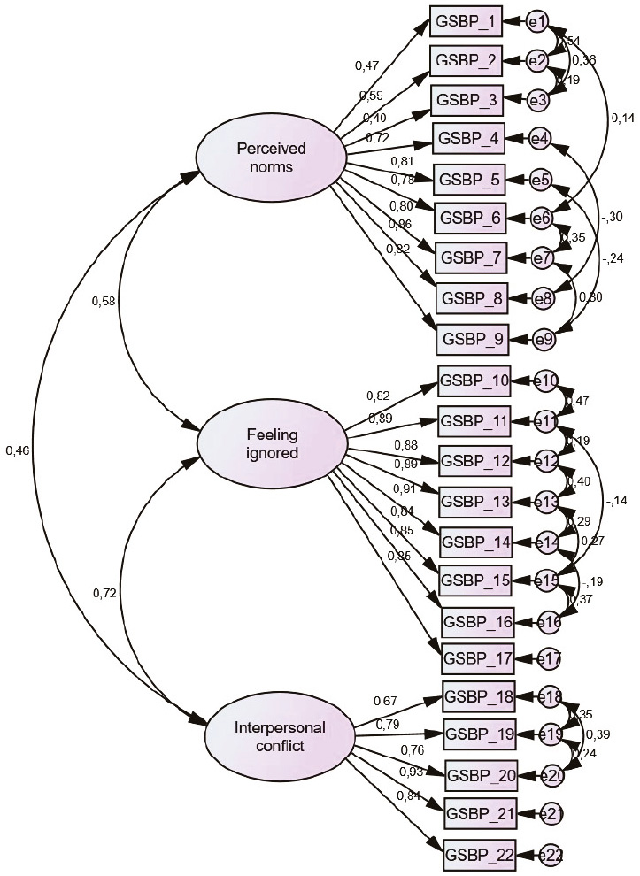 Table 4 shows the descriptive statistics of the Portuguese version of the GSBP and its reliability. The value of Cronbach’s alpha in this study (interpersonal conflict α=0.92; perceived norms α=0.95; feeling ignored; α=0.97) I is higher than that of the original version, and in the original version (interpersonal conflict α=0.90; perceived norms α=0.92; feeling ignored; α=0.94; Chotpitayasunondh & Douglas, 2018) the instrument was also composed of 22 items and 3 factors (perceived norms; feeling ignored; interpersonal conflict). The values of CR, AVE and discriminant validity are within the reference values.