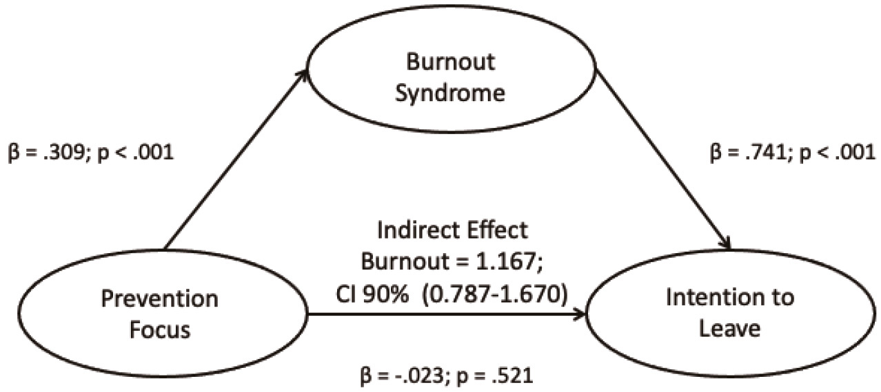 Regarding the hypothesis test, the results pointed out that the relationship between Prevention Focus and Intention to Leave was negative and not statistically significant (β=-.023; p=.521), therefore hypothesis H(1) was not supported. The relationship between Prevention Focus and Burnout Syndrome was positive and statistically significant (β=.309; p<.001), supporting H(2). Burnout Syndrome showed a positive and statistically significant influence on Intention to Leave (β=.741; p<.001). Also, the results showed that Burnout Syndrome mediates the relationship between Prevention Focus and Intention to Leave (indirect effect=1, 167; 90% confidence interval [CI], 0.787-1.670), supporting hypothesis H(3), as shown in Figure 1.