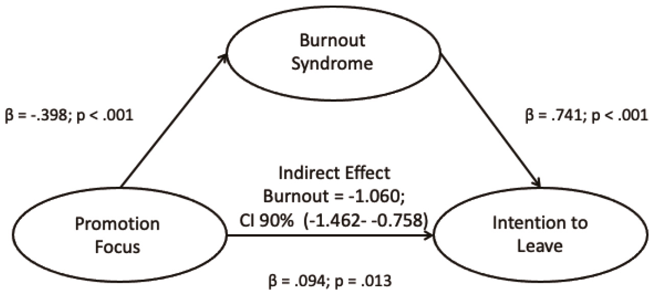 Analysis of the relationships between Promotion Focus and Intention to Leave was positive and statistically significant (β=.094; p=.013). These results support H(4). Promotion Focus was significantly and negatively associated with Burnout Syndrome (β=-.398; p<.001), supporting H(5). Burnout Syndrome was significantly and positively associated with Intention to Leave (β=.741; p<.001). In addition, the results showed that Burnout Syndrome mediates the relationship between Promotion Focus and Intention to Leave (indirect effect=-1.060; 90% CI, -1.462 to -0.758), supporting hypothesis H(6), as shown in Figure 2.
