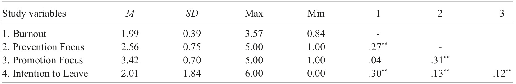 Concerning Intention to Leave, Prevention Focus is associated with a commitment to stay, which may reduce the likelihood of turnover. Promotion-focused people may be more likely to leave their organizations as they seek better opportunities elsewhere to achieve their desired goals (Andrews et al., 2014).