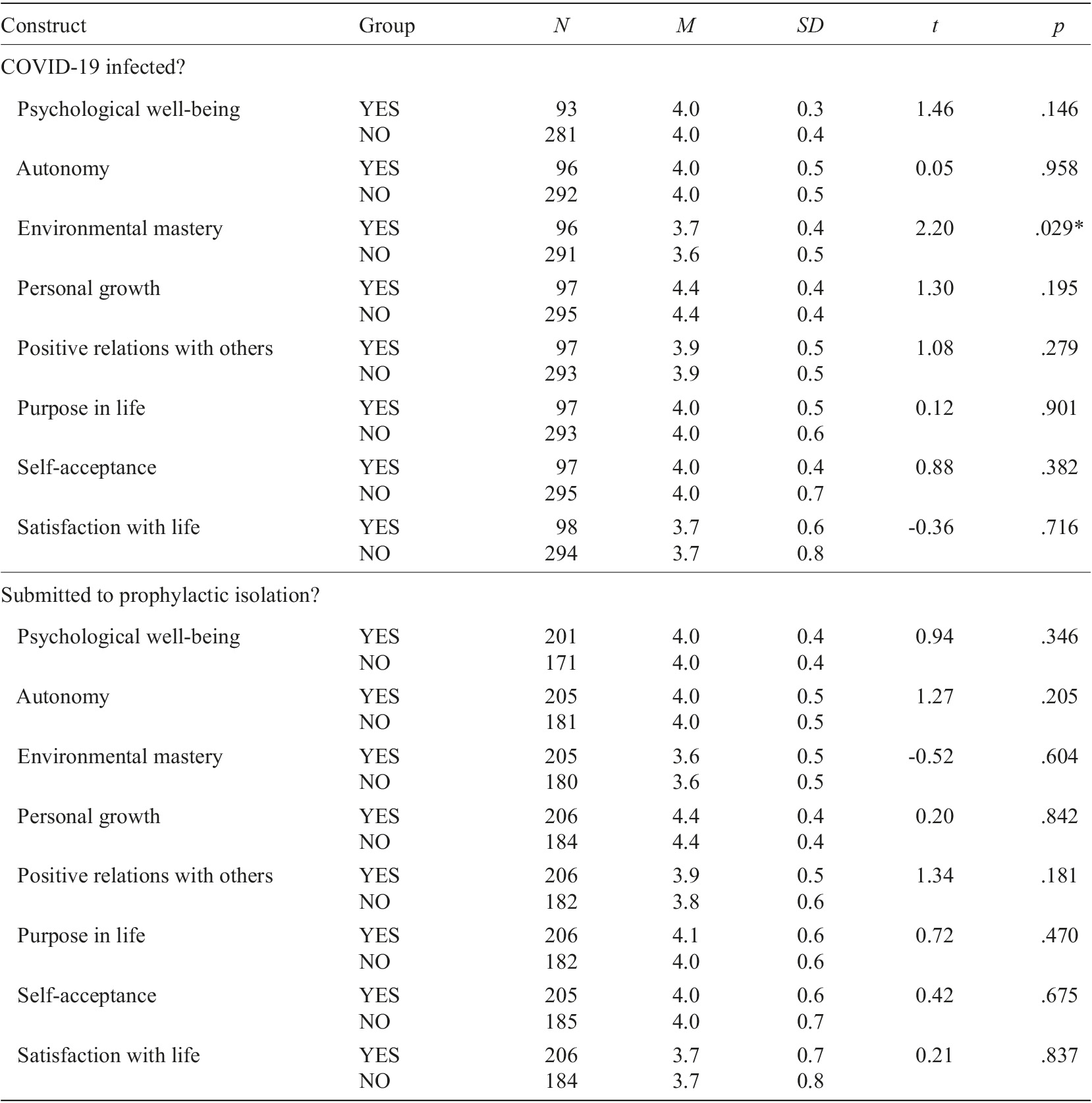 Comparative analysis between students who were and those who were not submitted to prophylactic isolation due to possible infection in psychological well-being or satisfaction with life