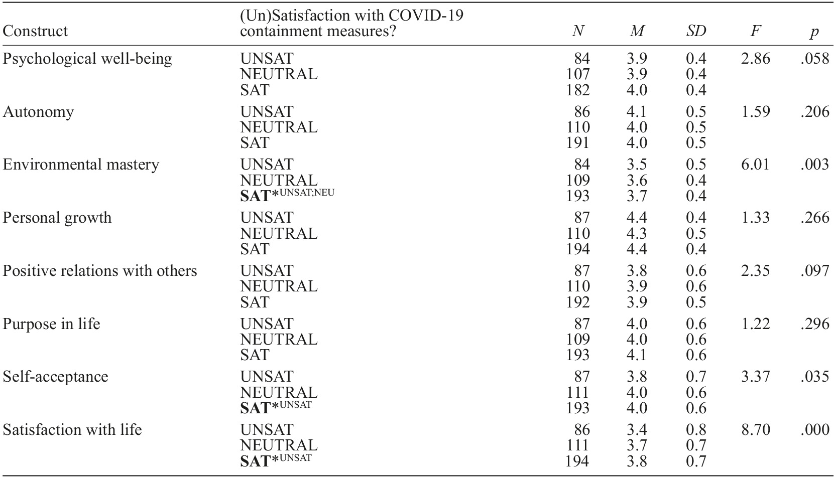 Comparative analysis between students unsatisfied, neutral and satisfied with COVID-19 containment measures in psychological well-being or satisfaction with life