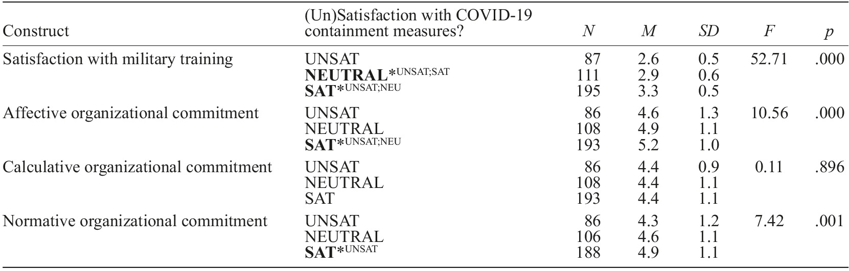Comparative analysis between students unsatisfied, neutral and satisfied with COVID-19 containment measures on satisfaction with military training or organizational commitment?