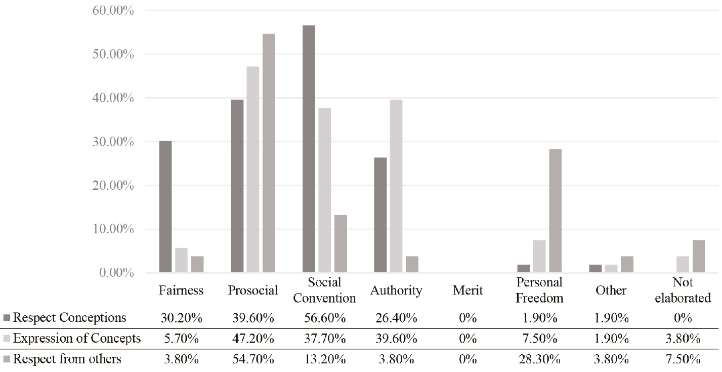 Most children used one or two themes to describe their concept of respect (see Table 1). When specifically answering to each domain of respect (i.e., Respect Concept, Expression of Respect, and Respect from Others), most children employed at least one Ethical theme (i.e., Fairness, Prosocial or Personal Freedom). Specifically, 34.0% used it in all domains, 37.7% in two domains, 11.3% in one domain, and 17.0% did not use it in any domain. Regarding children’s respect evaluation and associated reasoning in the three social contexts (i.e., Social Inclusion, Sharing Fairly, and Academic Achievement) Ethical themes were the most used except for the academic- related goals (see Table 1). Children predominantly exclusively used Ethical themes when addressing Respect from Others, Social Inclusion and Sharing Fairly (see Table 1).