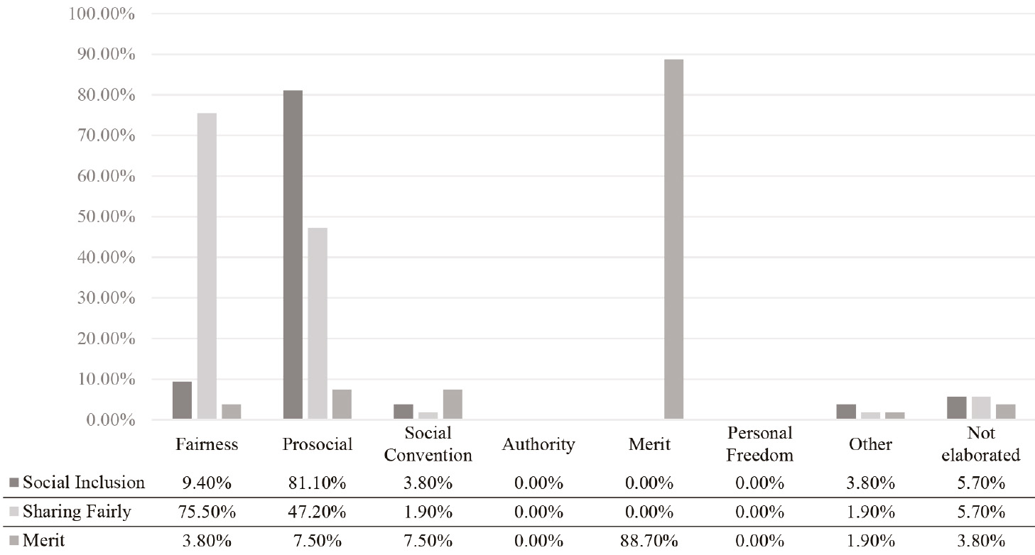 Concerning children’s evaluations of respect for each story context, Figure 2 displays the percentage by theme. In the Social Inclusion story, the majority of children mentioned Prosocial (81.1%). For the Share Fairly story, Fairness was the most mentioned theme (75.5%), followed by Prosocial (47.2%). Finally, in the Academic Achievement story, the Merit theme was mentioned by 88.7% of the children.