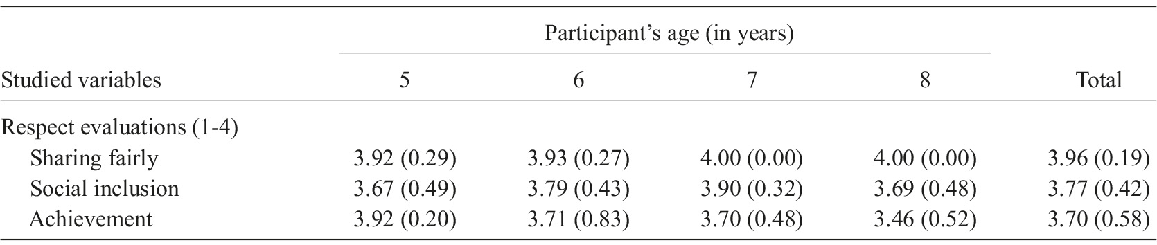 The present sample presented high levels of evaluations of respect (M sharing fairly=3.96, SD=0.19; M social inclusion=3.77, SD=0.42; M academic achievement=3.70, SD=0.58). However, significant differences were observed between sharing fairly and social inclusion [t(53)=3.12, p<.001] and between sharing fairly and academic achievement [t(53)=3.08, p<.01]. Additionally, a significant correlation between social inclusion and academic achievement was found (r=.43, p>.001). When looking into significant differences regarding respect evaluations, boys evaluated academic achievements as worthier of respect than girls [t(-2.345)=39.69, p<.05, M girls=3.54, SD=0.69; M boys=3.88; SD=0.33]. Furthermore, older children (≥7 years old) revealed lower respect evaluations by one’s achievement than younger children [t(49.322)=-2.91, p<.01, M younger=3.94, SD=0.24 M older=3.58, SD=0,65]. For further description of age differences, Table 2 presents the children’s respect evaluations by age group.