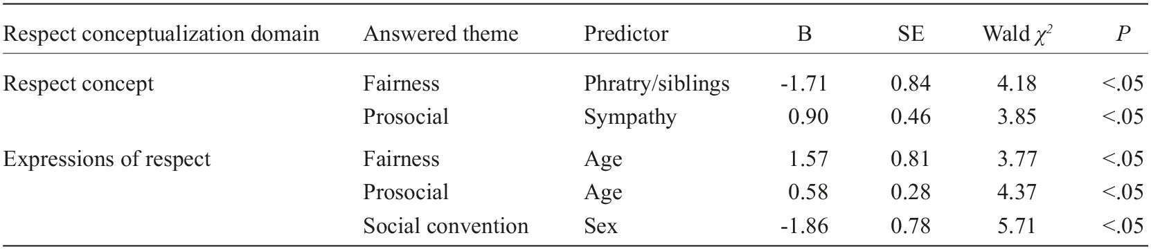 Several logistics regressions were performed with child age, sex, siblings, and phratry, as well as sympathy as independent variables and respect conception within each domain as the dependent variable. For the conception of respect, there was a main effect of phratry on fairness (Wald χ 2 =4.18, p<.05; b=-1.71, SE=.84) and sympathy on prosocial (Wald χ 2 =3.85, p<.05; b=.90, SE=.46). For Expressions of respect, there was a main effect of child’s age on fairness (Wald χ 2 =3.77, p<.05; b=1.57, SE=.81) and on prosocial (Wald χ 2 =4.37, p<.05; b=.58, SE=.28); sex on social convention (Wald χ 2 =5.71, p<.05; b=-1.86, SE=.78). No other significant result was found (see Table 3).