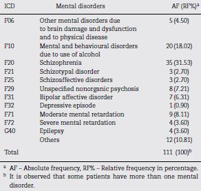 Regarding to the nosological profiles, Table 2 reveals that there are patients with more than one type of mental disorder and that schizophrenia is the most prevalent mental disorder (31.53%).