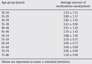 The average number of medications used by patients was 3.11±1.41 medications/patients. The largest consumption of medications was found in the 7580 years group, 5.5 medications for patient (Table 5). These data are in with the literature. Elderly population is marked by a higher frequency of chronic degenerative diseases. It has greater demand for health services and medication, which predisposes the geriatric population to great risks with the practice of polypharmacy and adverse effects of medications.32