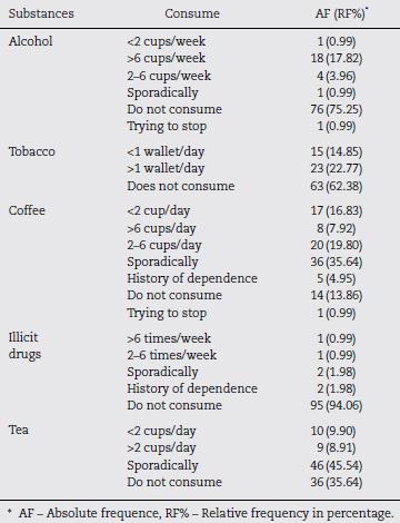 It is observed in Table 7 that 24.75% of patients consumed alcohol, 37.62% tobacco, 86.14% caffeine, 5.94% illicit drugs and 64.36% tea. It is necessary a further detailed study, since these substances can interact with several medications.