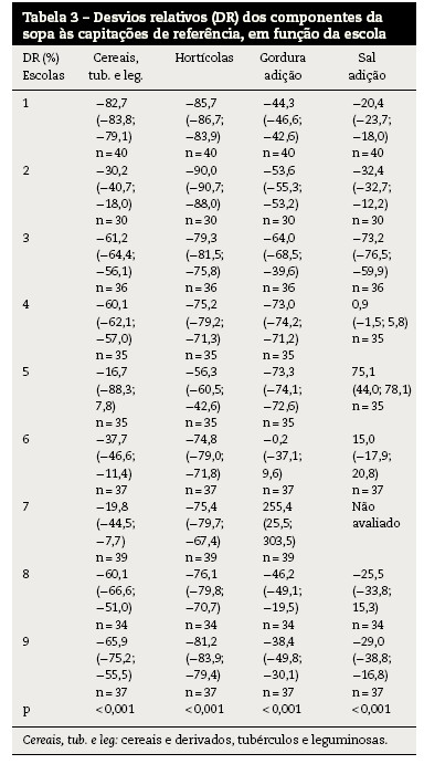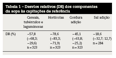 De acordo com os dados ilustrados na tabela 1, todos os componentes da sopa apresentaram um DR negativo, reproduzindo o baixo fornecimento destes ingredientes, comparativamente às capitações de referência.