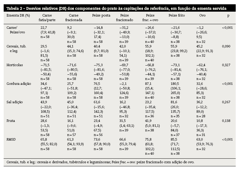 Considerando as refeições na sua totalidade foram encontradas diferenças estatisticamente significativas (p < 0,001) entre as medianas de RMSD nas diversas ementas, observando‐se o valor mais elevado de RMSD para as refeições de peixe frito e o valor mais baixo para a carne fracionada (tabela 2).