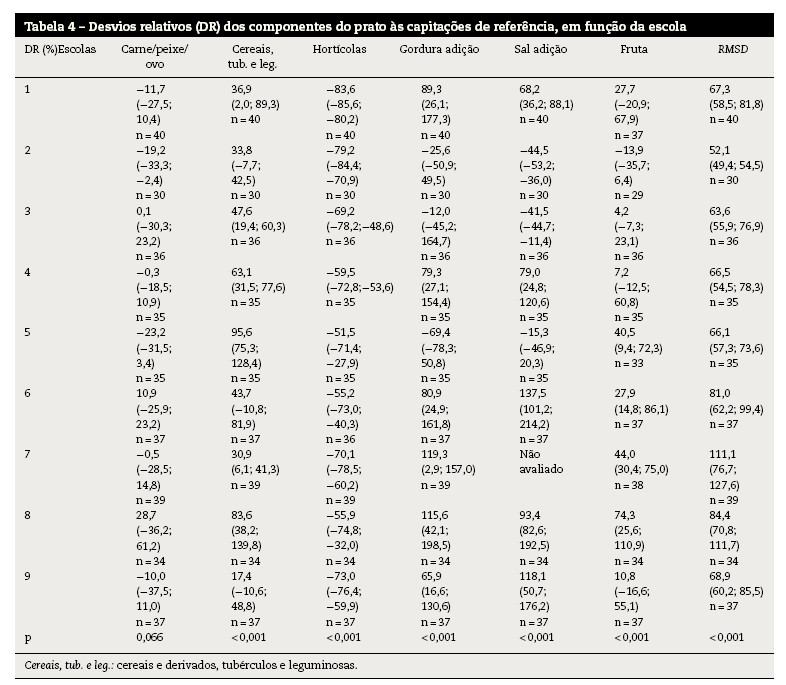 Foram encontradas diferenças estatisticamente significativas (p < 0,001) entre escolas para todos os constituintes da refeição, à exceção da componente proteica (tabelas 3 e 4).
