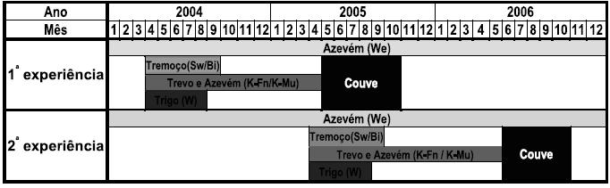 Figura 1 Calendário das cabeças de rotação (Tremoço doce (Sw) e amargo (Bi); Trevo e azevém cortado e retirado do campo (K-Fn) e deixado no campo (K-Mu); Trigo (W)), azevém (We) e cultivo de couve na primeira e segunda experiências.