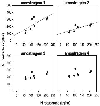 Na segunda experiência, foi também encontrada uma relação, mas directa, entre o N libertado no solo pelos diferentes métodos de fertilização com germinados de tremoço e o seu N recuperado um e dois meses após a sua incorporação no solo, nas amostragens 1 e 2 respectivamente (Figura 10). A inclinação e o r2 em cada regressão linear mostram que até com um ajustamento fraco (baixo r2) a influência do N recuperado pelos germinados de tremoço no N libertado foi, provavelmente, mais forte um mês após a incorporação dos germinados de tremoço (amostragem 1) do que dois meses depois (amostragem 2).