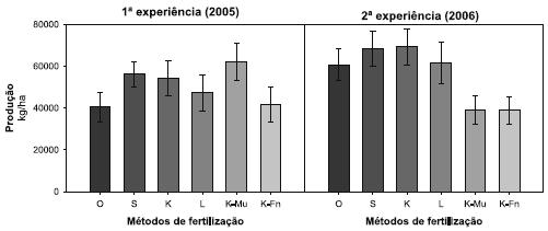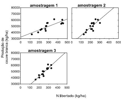 A eficácia dos três métodos de fertilização testados foi principalmente confirmada na primeira experiência, com uma elevada relação encontrada entre a libertação cumulativa de N em cada amostragem e produção média de couve. De acordo com Everaarts & Booji (2000), o aumento da produção com o aumento das taxas de aplicação de N deve-se a aumentos na concentração em N nas plantas, acompanhado pelo aumento da concentração em proteína e uma resultante maior capacidade de retenção de água.