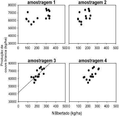 Na primeira experiência, foi encontrada uma relação directa entre o N libertado no solo pelos diferentes métodos de fertilização com sementes e germinados de tremoço em cada amostragem e a produção de couve (Figura 11). A análise da inclinação e r2 de cada regressão linear na Figura 8 mostra que a maior influência do N libertado na colheita de couve e que a relação directa mais forte entre estes dois factores ocorreu à data de colheita.