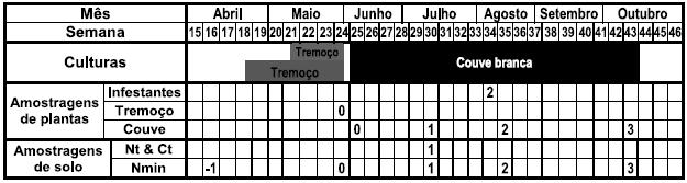 Em ambas as rotações, após as cabeças de rotação (tremoço ou azevém com trevo), 4,3 plantas/m2 (0,5 m x 0,47 m) de couve branca foram cultivadas em todos os blocos excepto nos de azevém (We). Após plantação as couves foram regadas e protegidas com redes contra pragas e predação. As redes foram ocasionalmente removidas para o controlo de infestantes (mecânica ou manualmente, de acordo com o tamanho das couves) e colheita de amostras. Foram permanentemente removidas quando as couves já possuíam tamanho suficiente para resistir à predação.