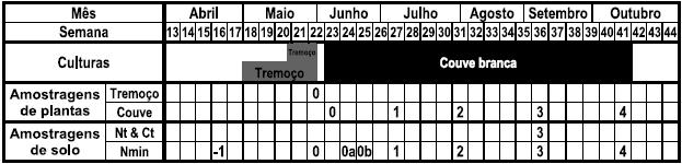 Em ambas as rotações, a primeira amostragem de plantas de couve realizou-se à plantação com a recolha casualizada de doze plântulas de couve (amostragens 0 nas Figuras 2 e 3). De seguida, na primeira rotação, recolheram-se mais três amostras de plantas de couve, duas em 1,4 m2 e uma em 1,9 m2 em todos os blocos (amostragens 1, 2 e 3 na Figura 2). Na primeira rotação as infestantes também foram colhidas, na amostragem 2, e consideradas para a disponibilidade de N no sistema solo-planta. Durante a segunda rotação recolheram-se amostras de plantas de couve em 1,4 m2 em três amostragens e numa quinta amostragem em 2,3 m2 em todos os blocos (amostragens 1, 2, 3 e 4 na Figura 3). Todas as amostras foram usadas para determinar o peso fresco das couves e sub-amostragens foram realizadas para o cálculo do peso seco e conteúdo em N (pelo método Kjeldahl). Nas últimas amostragens de ambas as rotações o peso e o conteúdo em N foram analisados nas couves e resíduos de colheita separadamente. As sub-amostras foram secas a 70ºC por um a três dias.