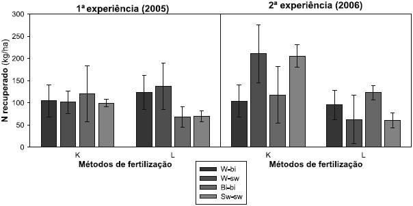 Figura 4 Valores médios de N recuperado nas diferentes estratégias de fertilização (sementes/germinados de tremoço amargo após o cultivo de trigo (W-bi) ou tremoço amargo (Bi-bi) e sementes/germinados de tremoço doce após o cultivo de trigo (W-sw) ou tremoço doce (Sw-sw)) com germinados de tremoço com tempo de crescimento curto (K) e longo (L), na primeira e segunda experiência. As barras das colunas indicam o desvio padrão.