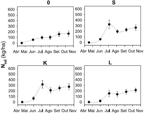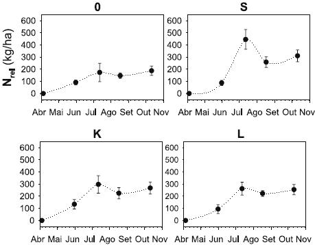 Após quatro semanas, os métodos de fertilização com sementes de tremoço trituradas (S) e germinadas com um curto período de crescimento (K) atingiram picos na libertação cumulativa de N (323 e 315 kg/ha, respectivamente), similares entre si mas superiores ao método de fertilização com germinados de tremoço com um tempo longo de crescimento (L) e tratamentos de controlo (O). Durante o resto do desenvolvimento das plantas de couve, os métodos de fertilização com sementes de tremoço trituradas (S) e germinados de tremoço com curto período de crescimento (K) atingiram os valores médios cumulativos de libertação de N mais elevados. Estes resultados mostram que, nas condições de campo de 2006, dos três métodos de fertilização testados (S, K e L) apenas os métodos de fertilização com sementes de tremoço trituradas (S) e germinadas com um curto período de crescimento (K) foram capazes de aumentar a libertação de N no solo.