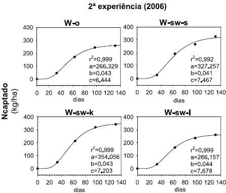 Na Figura 7 apresentam-se os gráficos com a equação de Chapman, os seus três parâmetros e o r2, ajustada à quantidade de N das plantas de couve em cada amostragem da segunda experiência usado para calcular a quantidade de N absorvido pelas plantas de couve fertilizadas com tremoços doces após o cultivo de trigo nas duas amostragens extra de solo, 0a e 0b (ver Figura 3). As plantas de couve fertilizadas com sementes de tremoço doce trituradas (W-sw-s) e com germinados de tremoço doce com curto período de crescimento curto à época de colheita atingiram valores médios de N superiores a 300 kg/ha e também superiores aos restantes tratamentos testados.