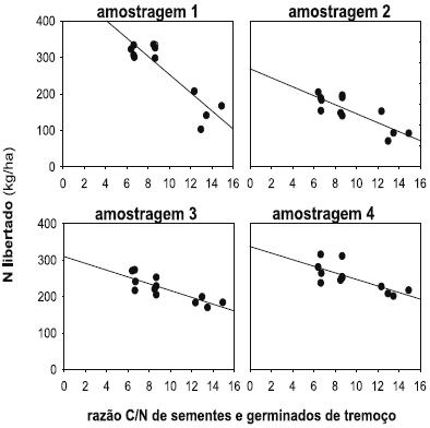 Na segunda experiência, foi encontrada uma relação inversa entre o N libertado no solo pelos diferentes métodos de fertilização usando sementes de tremoço trituradas ou germinadas e a sua razão C:N. A inclinação e o r2 em cada regressão linear na Figura 9 mostram uma grande influência da razão C:N das sementes e germinados de tremoço na libertação de N. Uma forte relação inversa entre estes dois factores ocorreu um mês após a incorporação no solo das sementes e germinados de tremoço (amostragem 1), mas esta relação atenuou-se em datas posteriores.