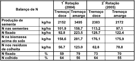 Quadro 1 Colheita e distribuição de N nas culturas de tremoço doce e amargo antecedentes em ambas as rotações.